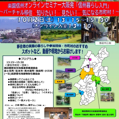 【終了しました】10/2日(土)楽園信州オンラインセミナー大阪発「信州暮らし入門」~バーチャル移住 知りたい! 見たい! 気になる市町村!~